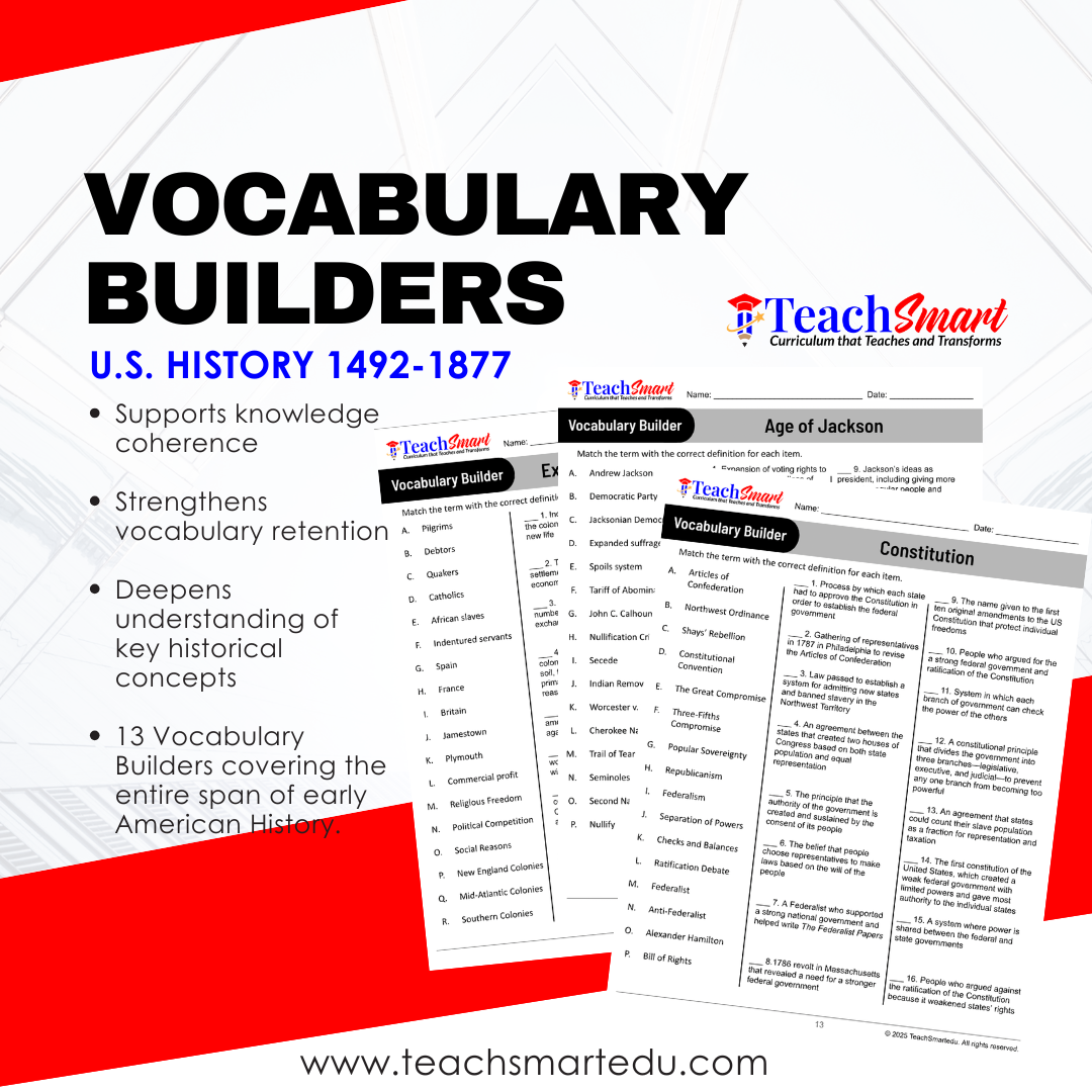 TeachSmart’s Vocabulary Builder helps students master essential academic terms through purposeful practice before, during, and after instruction. These matching activities are designed to improve comprehension, reinforce key concepts, and support retention across the entire U.S. History curriculum.