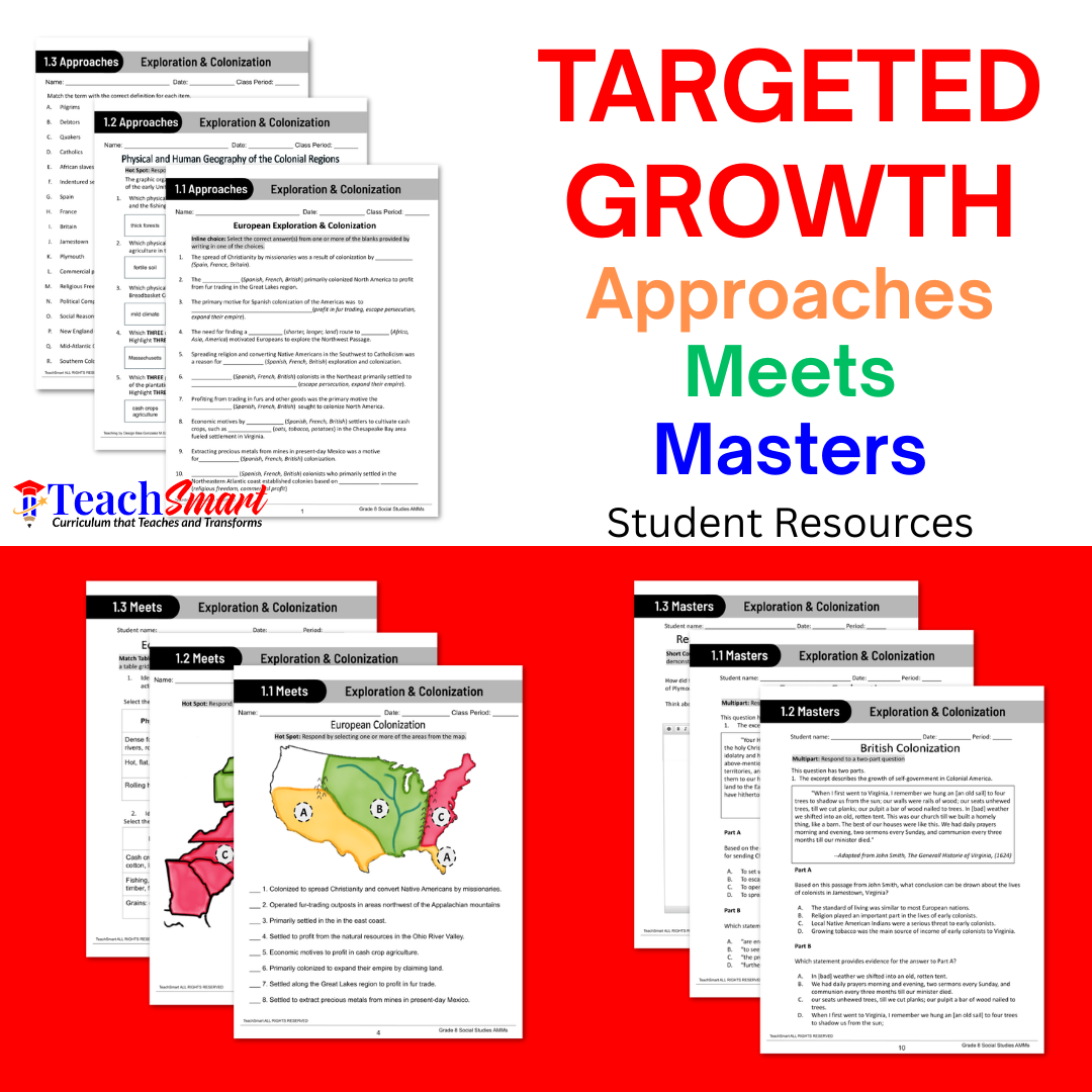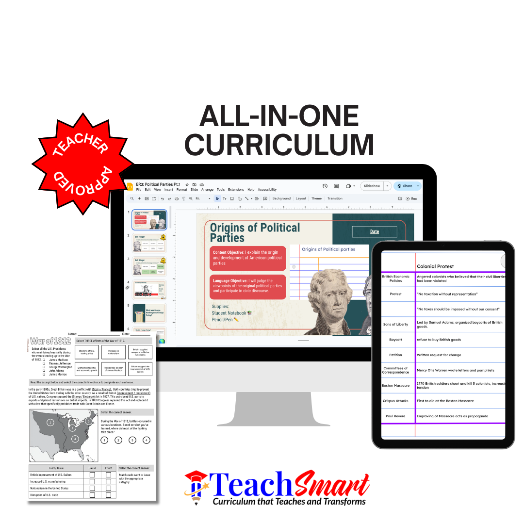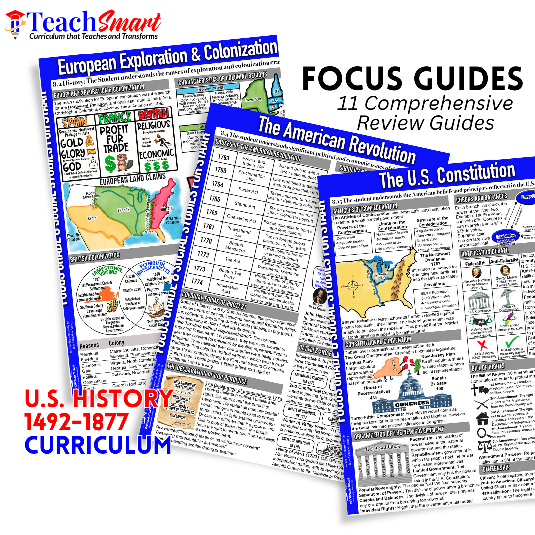 TeachSmart’s Focus Guides bring clarity to complex U.S. History content through visually engaging, one-page reference tools tailored specifically for middle school learners. These printable guides support student retention while building content confidence.